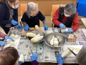 干し大根作りでは、昔ながらの知恵を教えて頂きながら、みんなで楽しく作業しました。